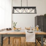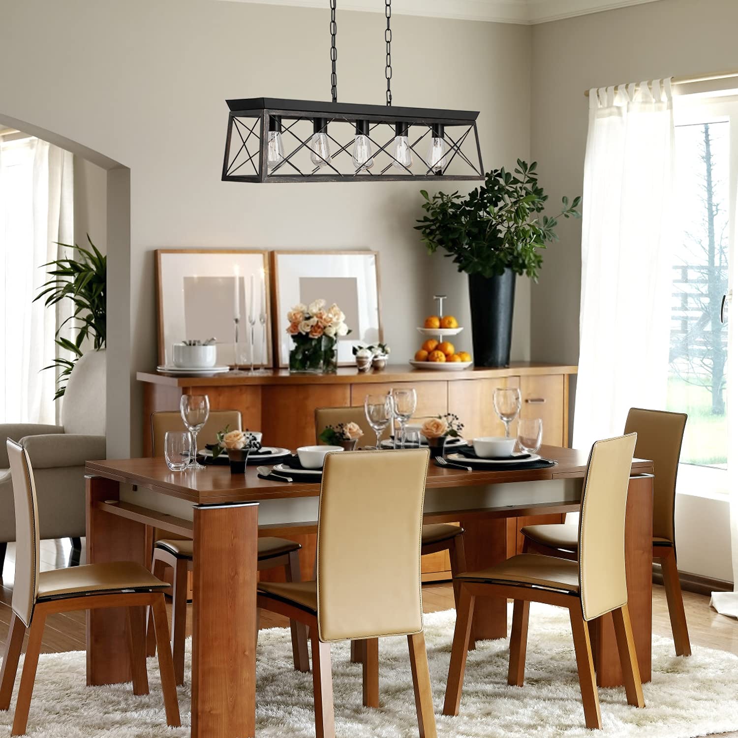 This dining room light fixture over the table is compatible with LED bulbs, incandescent bulbs, CFLs, Edison bulbs, halogen bulbs, and more. It is dimmable, with an E26 bulb base and a maximum power of 40W per socket (bulbs not included).