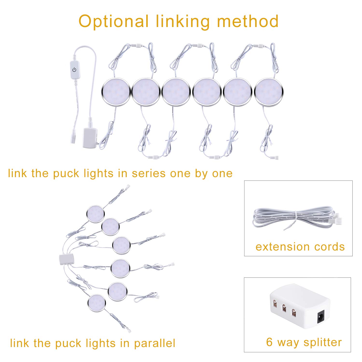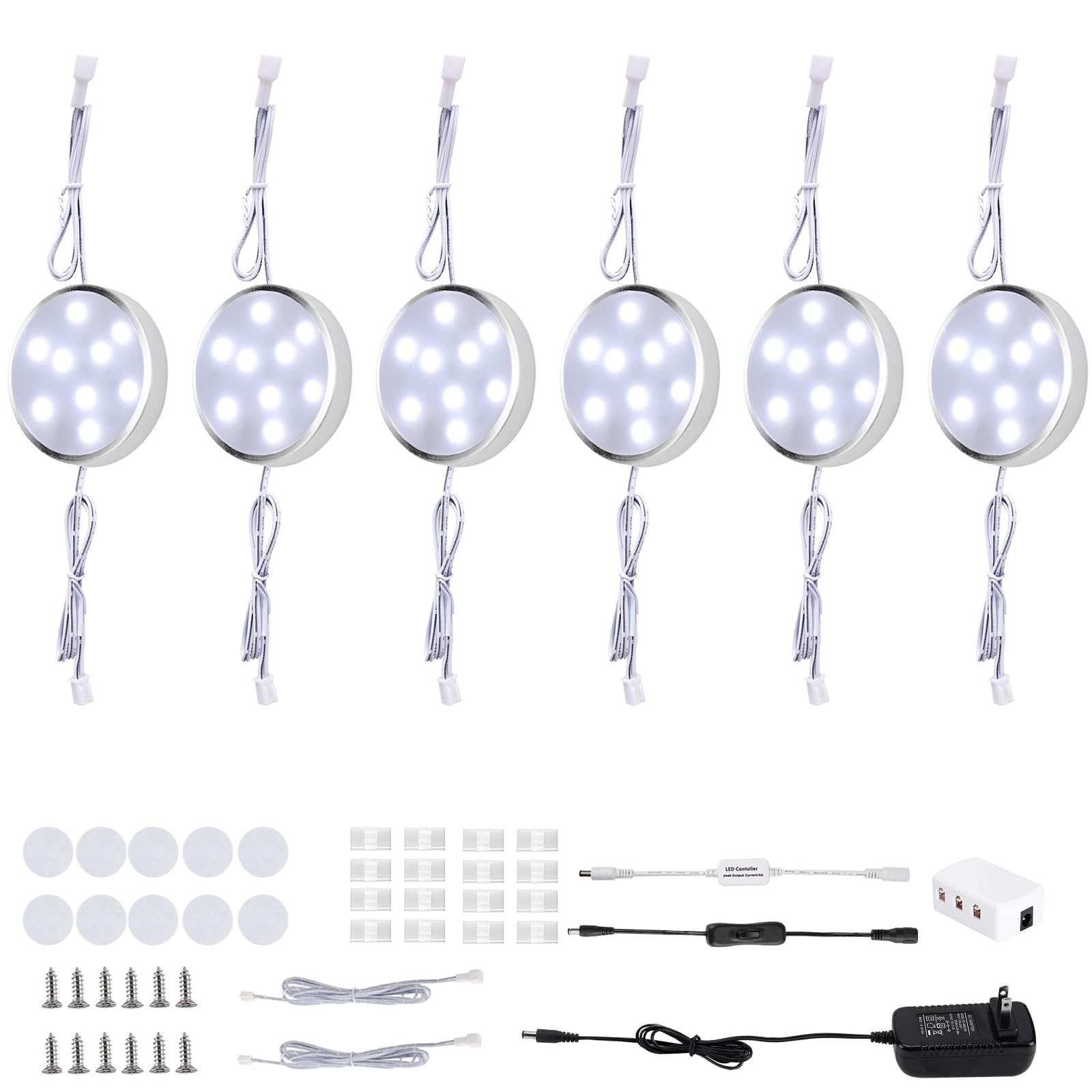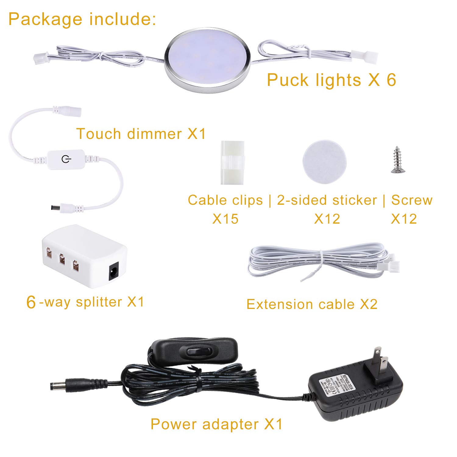 Safe to Use: Made of aluminum alloy, the puck lights have a good heat dissipation. ETL Listed standard US plug. 12VDC output. The professional color temp of the puck light is 6000K day white. Bright enough for food preparation or light up some collections.