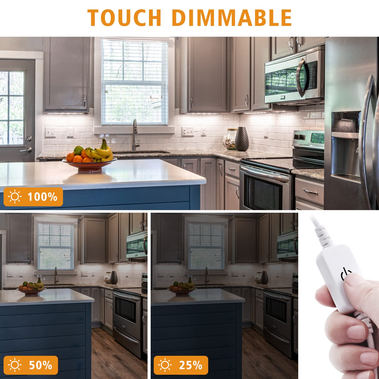 Wide Application: The dimmable under cabinet lights can be widely used in under counter, kitchen cabinet, showcase, closet, bookcase, etc.