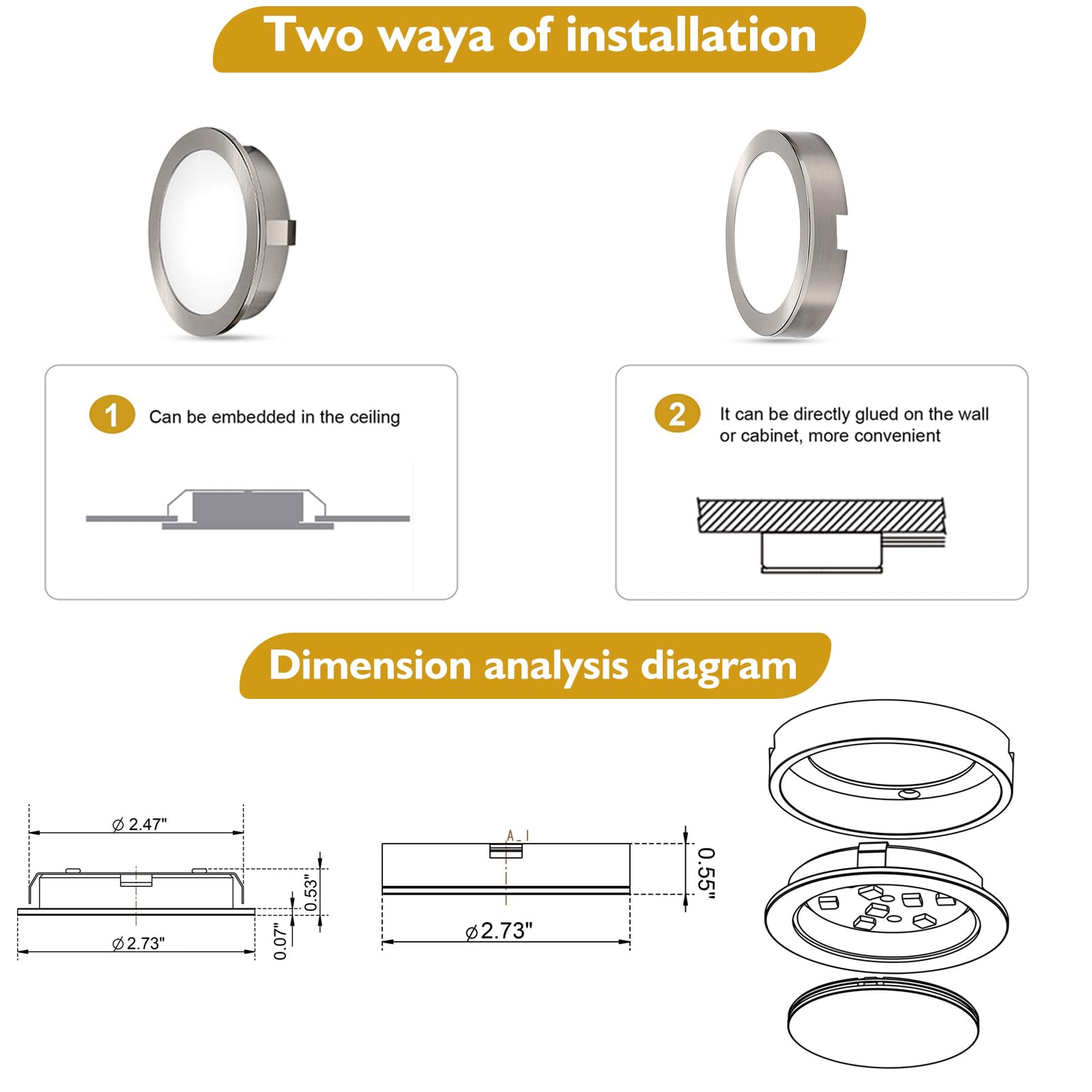 Premium Quality – This under cabinet lighting kit is made of high quality aluminum alloy and brushed nickel metal. Perfect for heat dissipation and looks elegant. And thess puck lights are backed by our 2-YEAR warranty, if there are any quality problems, please feel free to let us know!
