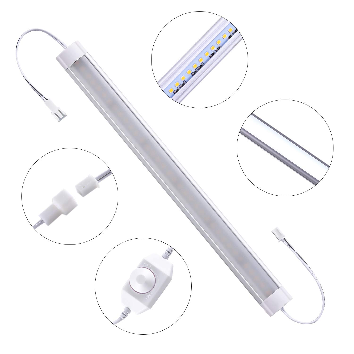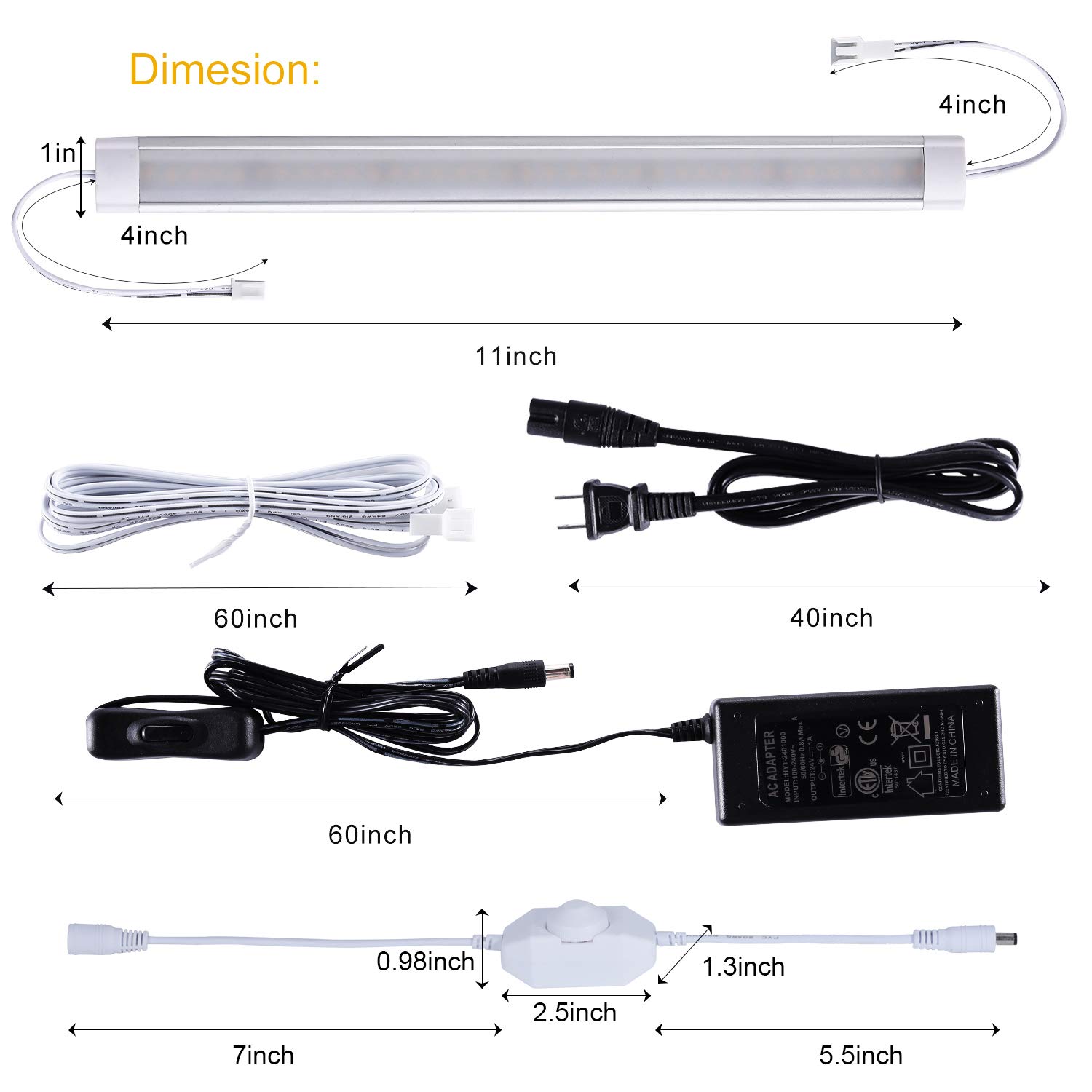 Dimmable: A rotary dimmer switch is included to dim all the under cabinet lighting plug in from 0%~100% brightness.You can choose your desired brightness and then turn on/off the under cabinet light by the rocker switch, so the dimming setting can be remembered for next time.All the under cabinet lights are 3W 24V to ensures a low wattage reduction,thus keeping the same brightness for linked strips from the first one to the last one.