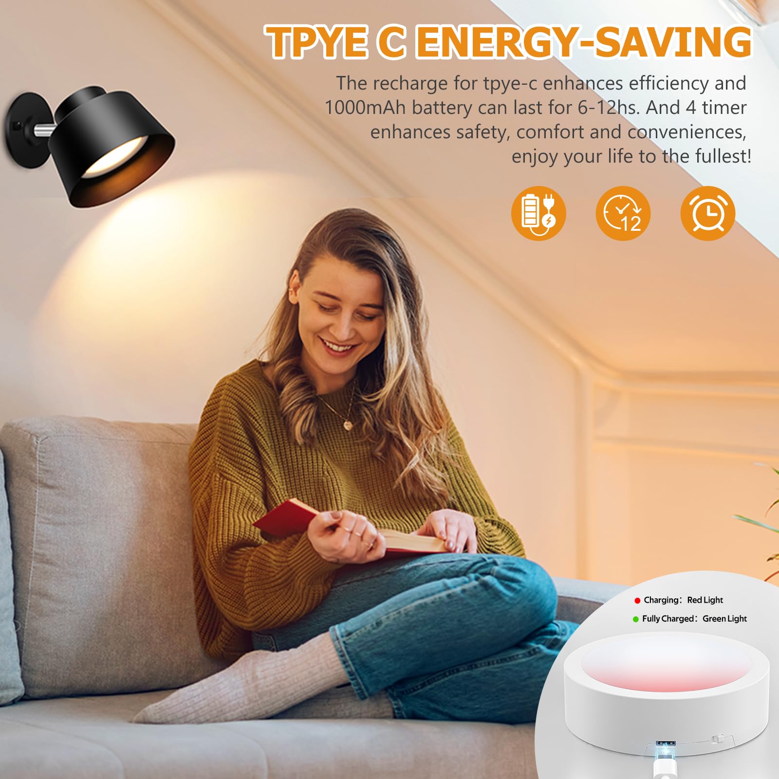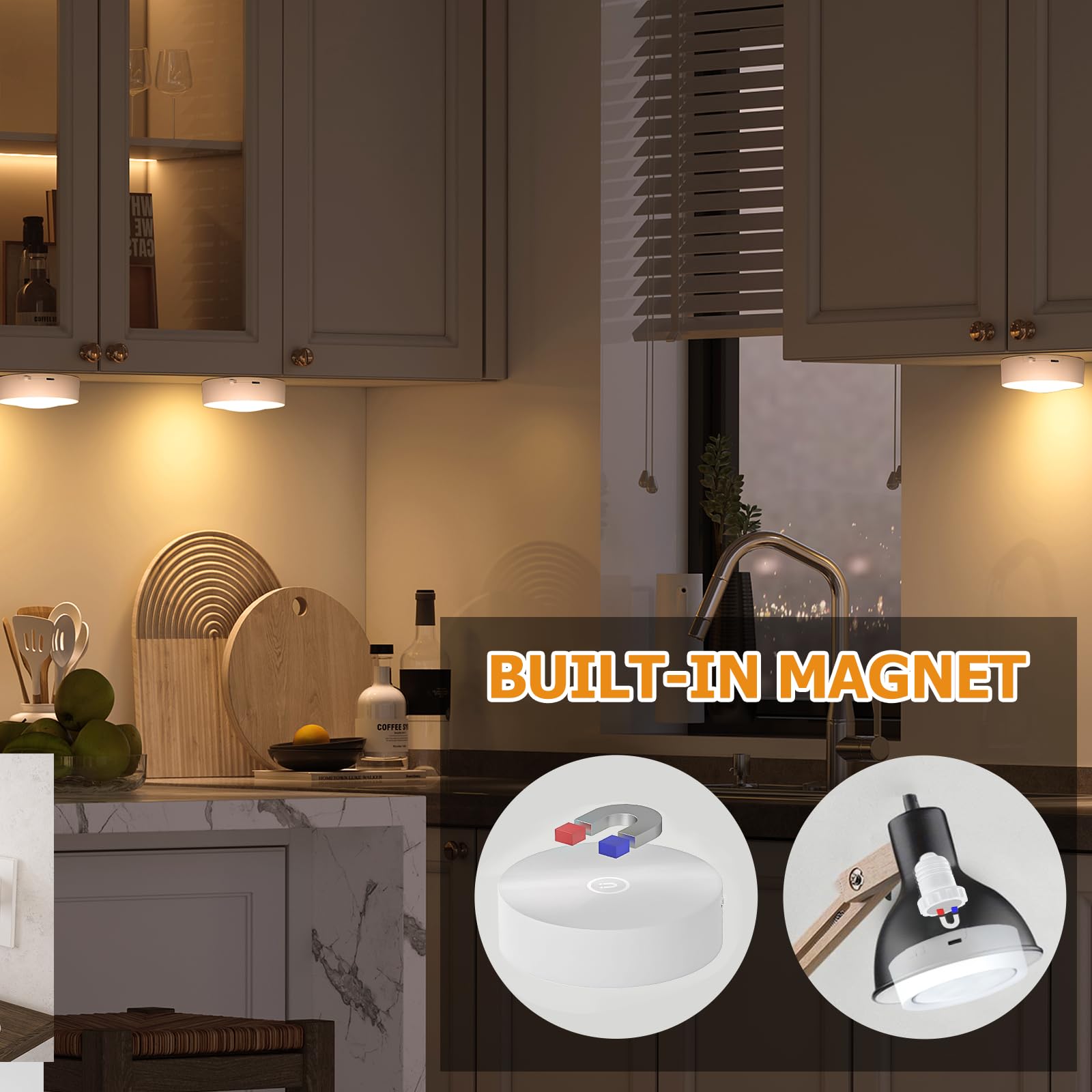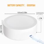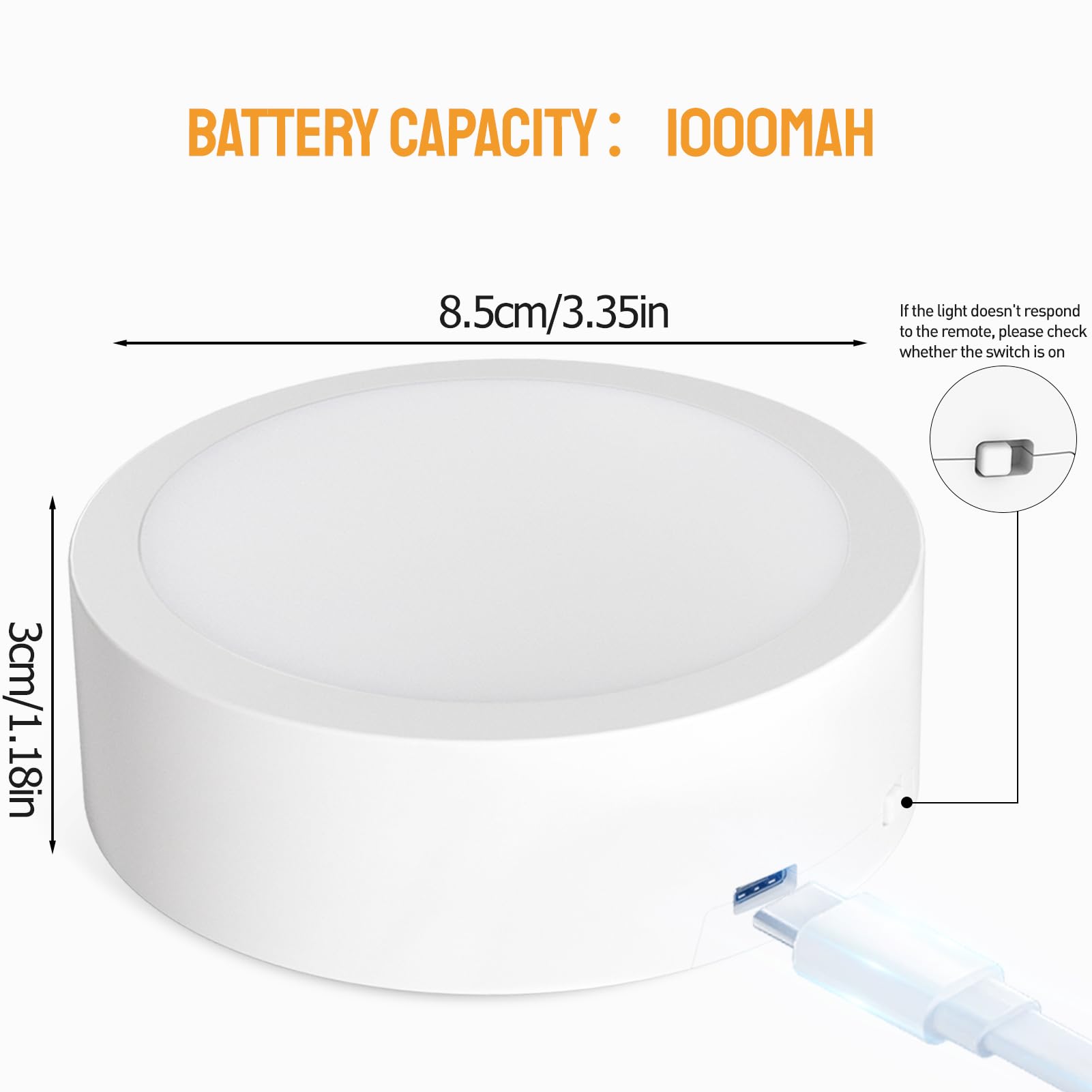 【Rechargable Puck Lights】 Portable wireless puck light with USB-C charging port.The puck lights are built-in 1200mAh large rechargeable battery, no need to buy extra batteries, environment-friendly and save money. Our usb rechargeable puck lights with remote lasts 12hrs on the Max Brightness.